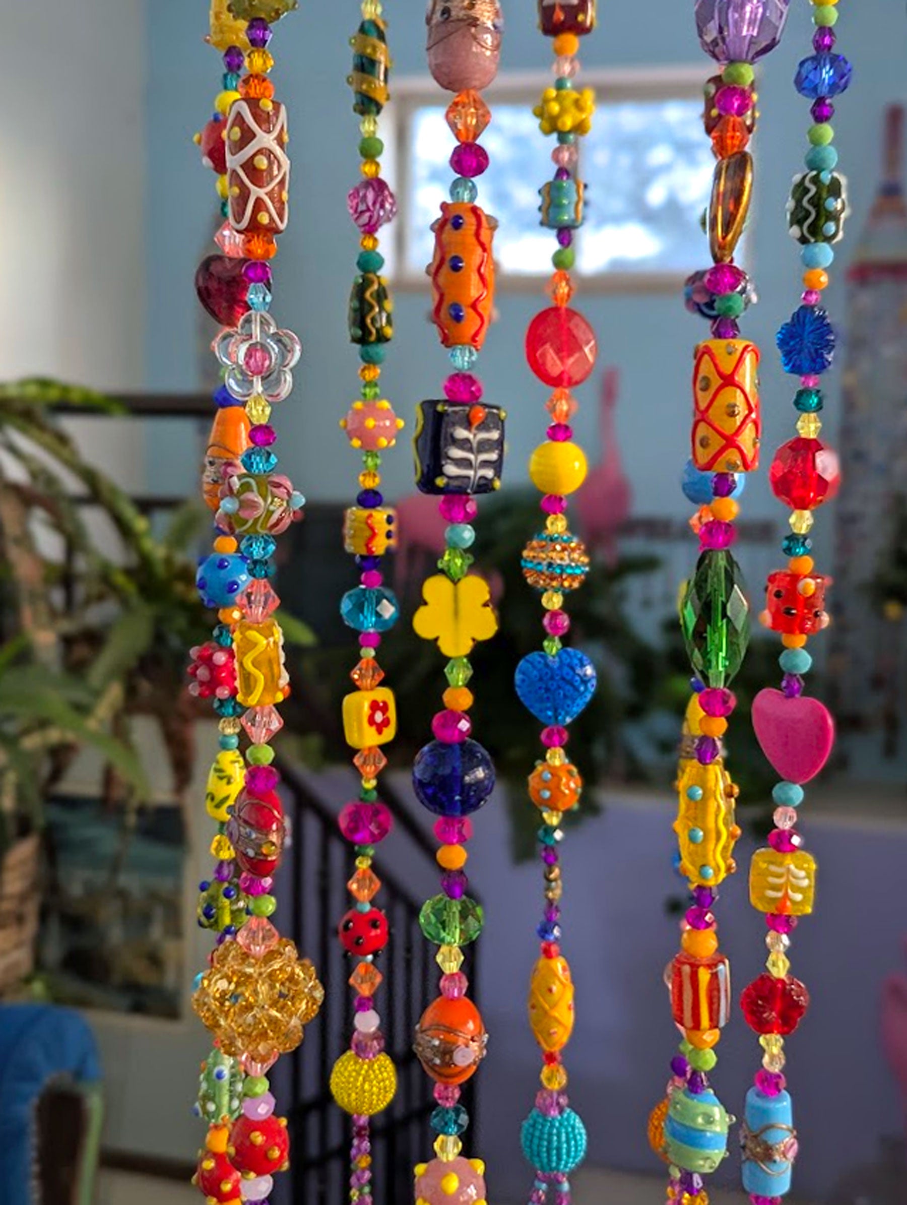 Lovingly created bead by bead in my colorful studio, this eye-catching piece features a rich mix of glass beads collected from around the world. Each strand flows beautifully from the decorative top ring and finishes with soft brass bells that create gentle movement and a delicate, soothing sound.
