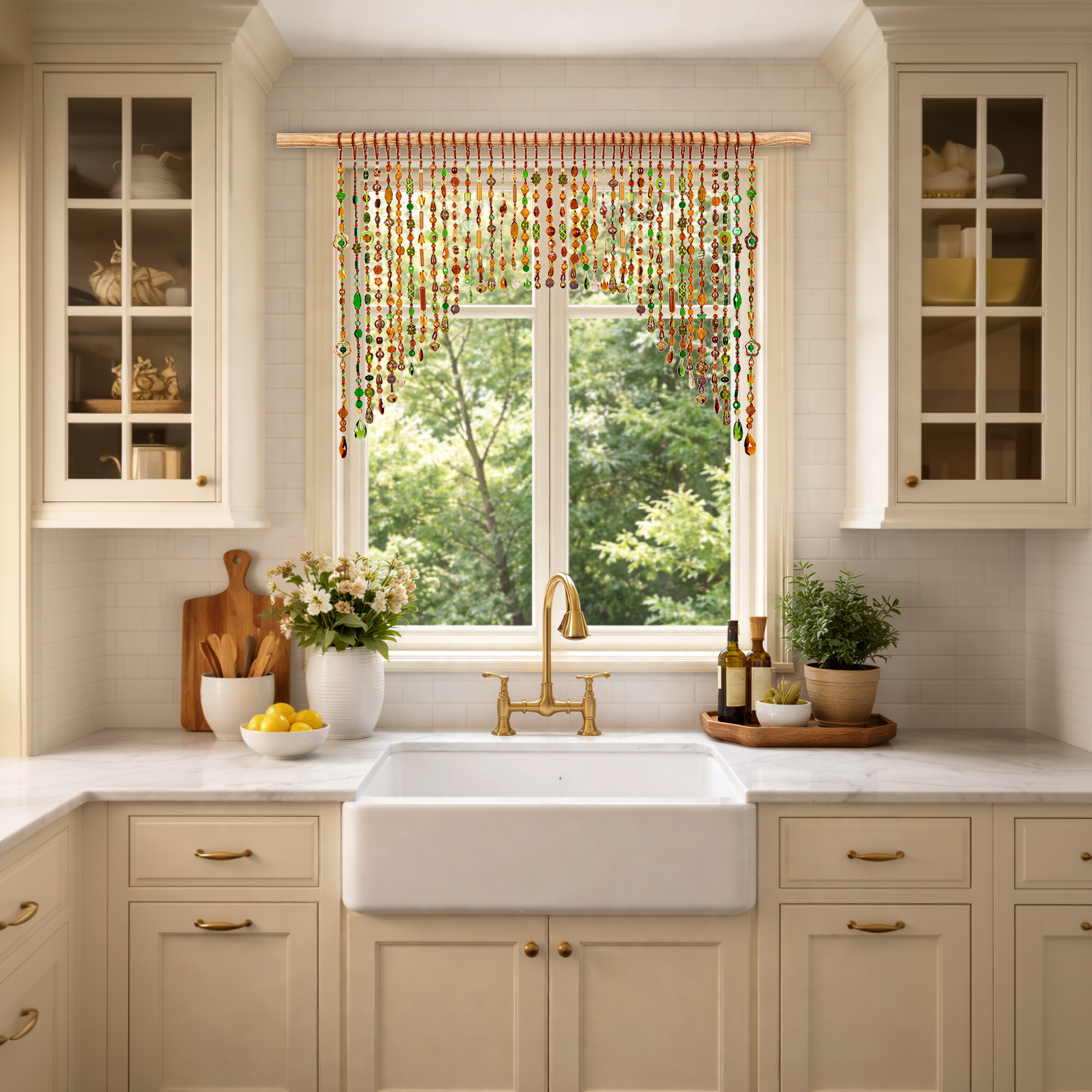 Because of its arched design, the curtain naturally frames the opening like a beaded doorway gate, creating a welcoming transition between spaces while still allowing light and movement to flow through.